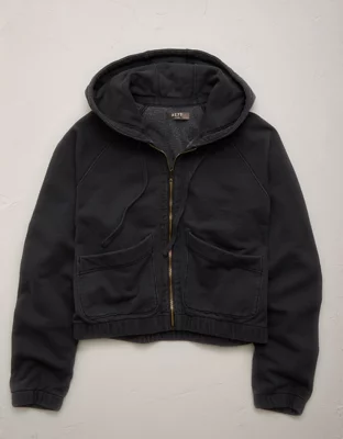 Cropped to perfection for an on-trend take of the iconic full-zip hoodie. Finished with slant pockets and raglan sleeves.