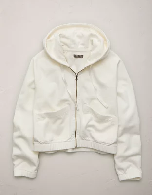 Cropped to perfection for an on-trend take of the iconic full-zip hoodie. Finished with slant pockets and raglan sleeves.