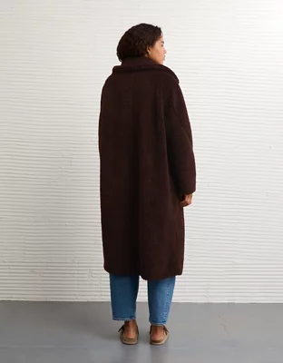 A chunky sherpa exterior gives this long topcoat a cozy look and feel.
