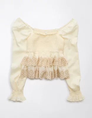 A feminine, frilly top for dressing up or down, featuring a tiered midriff for some extra movement.