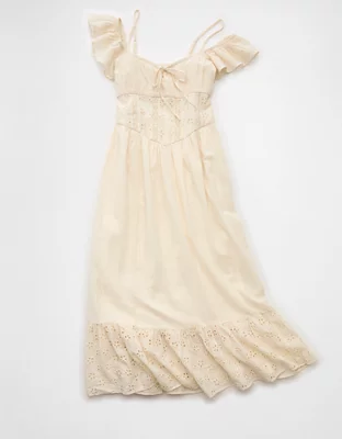 The epitome of a prairie daydream, this eyelet-embroidered midi dress features a sultry off-the-shoulder neckline, flattering V-waist and is finished with sweet smocking details at the back for added stretch.
